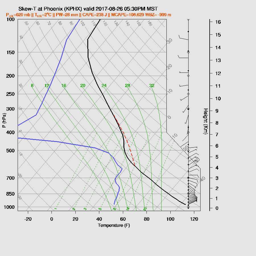 DCAPE from the 12Z Tucson sounding was quite high at around 1500 J/kg, thus there is a risk of strong to isolated severe microburst winds and strong outflow winds.